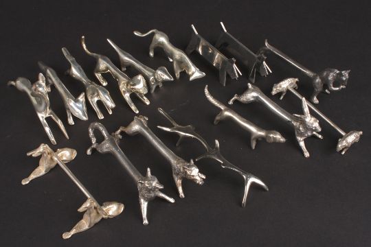 A collection of pairs of silver plated novelty animal knife rests including dogs, rabbits and boars - some pairs, some singles Condition: