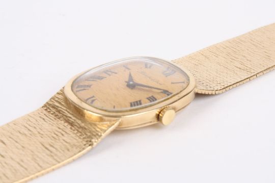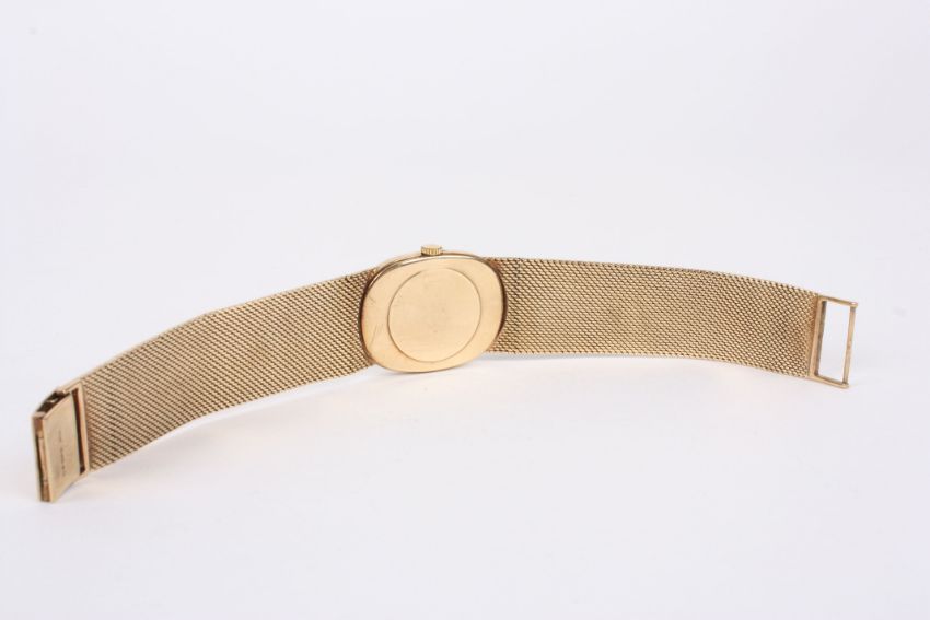 A 9ct gold Bueche Girod mechanical wrist watch with oval bark effect dial and black Roman numerals, within a plain oval case, with hand wound 17 jewel movement, on a 9ct gold bark effect mesh strap. 47 grams without movement.Condition: Appears to be in working order, winds, sets and runs. Dial in good condition, case with some wear, strap with slight stretching at the shoulders, otherwise in good condition.