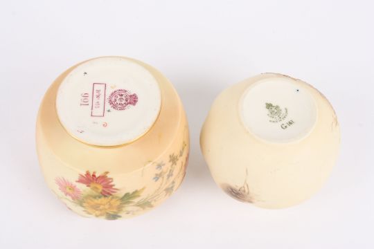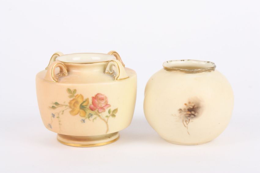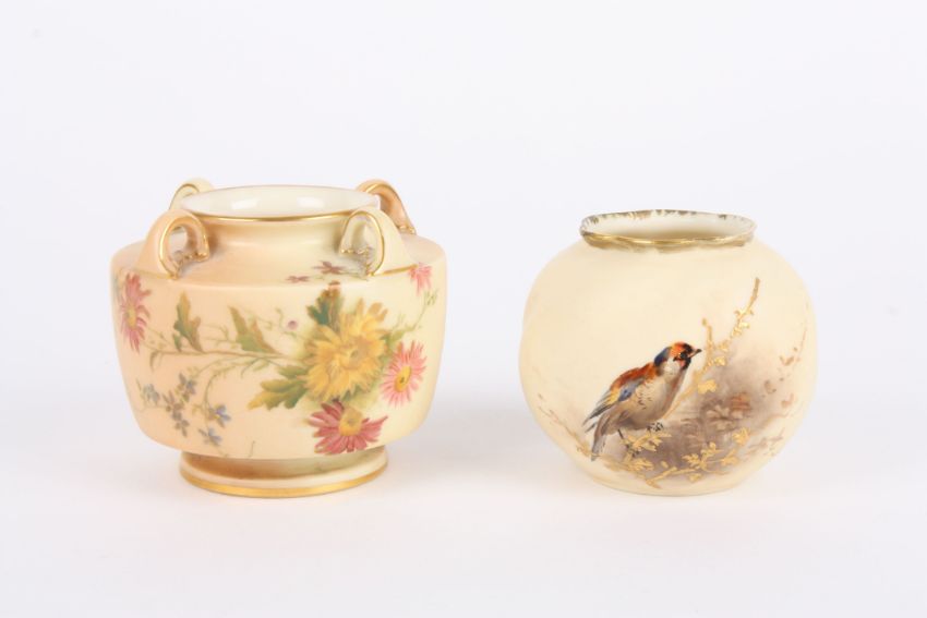 Two pieces of Royal Worcester blush ivory: a small globular vase decorated with a bird, numbered G161, and a small urn shaped vase with four small looped handles, numbered 991 (2) 6.5 and 7 cm high Condition: Both in good overall condition