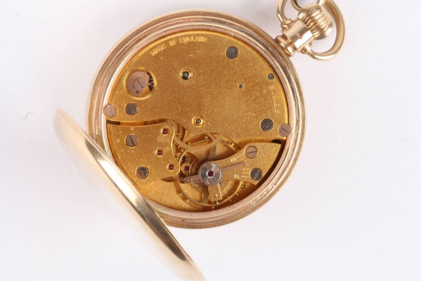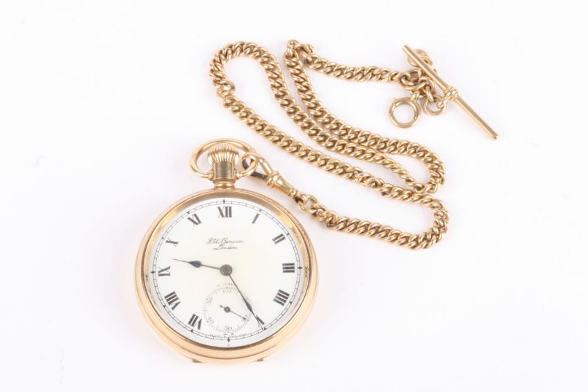 A 9ct gold J W Benson open face pocket watch the signed white enamel dial with black Roman numerals and subsidiary seconds dial, the movement numbered B7882, the case hallmarked 1952, on a 9ct gold Albert chain Pocket watch 80 grams. 25.6 grams.Condition: