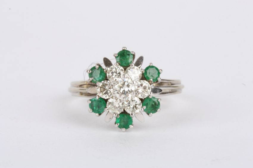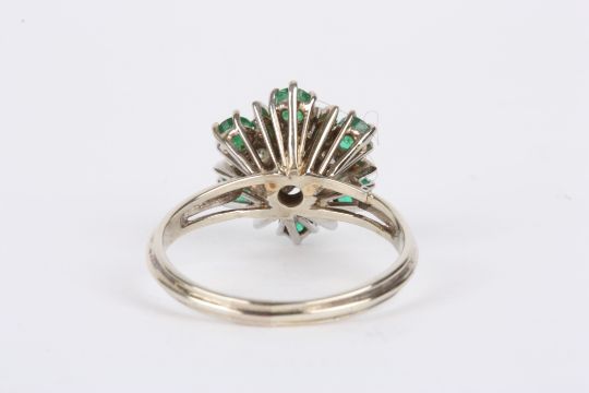 An emerald and diamond circular cluster ring with central seven stone raised diamond cluster within a six stone emerald border, 18ct white gold mount. Size PCondition: Overall good
