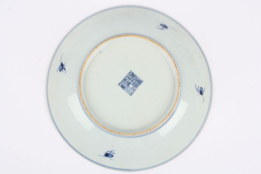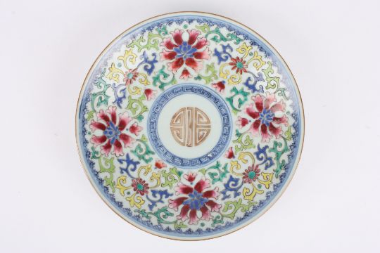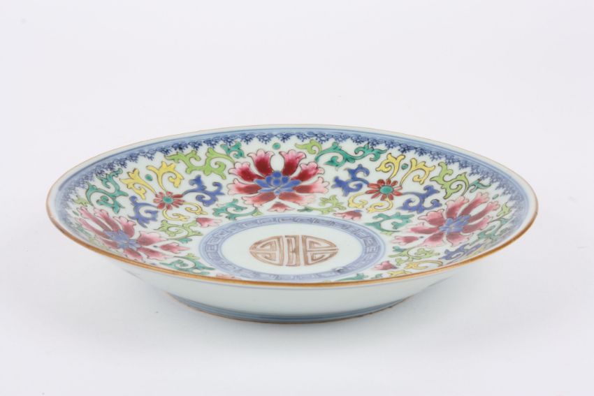 A Chinese famille rose plate decorated with a central roundel, surrounded by enamel flowers, with blue and white Qianlong seal mark to base diameter 20.4cmCondition: With small 'lump' underglaze - firing imperfection approximately 3mm x 2mm. No cracks or damage, just minor wear to the paint.