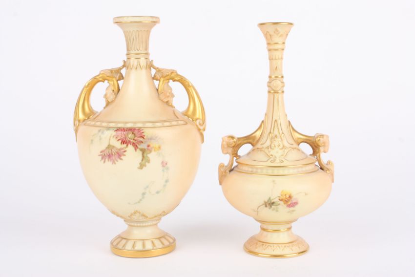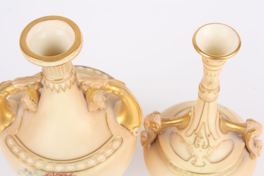Two Royal Worcester blush ivory vases both decorated with flowers, one with scrolled handles and a bulbous body, the other with mask handles and a slender neck, puce mark and numbered 1683 and 1600 to the base (2) 18.5 cm and 18 cm high Condition: Both in good condition.