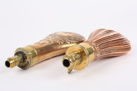 Two 19th century power flasks one with fluted body, the other with embossed scrolls, both with brass nozzles. Condition: Both in fairly good condition, with only minor dents and wear, both with small seam splits.