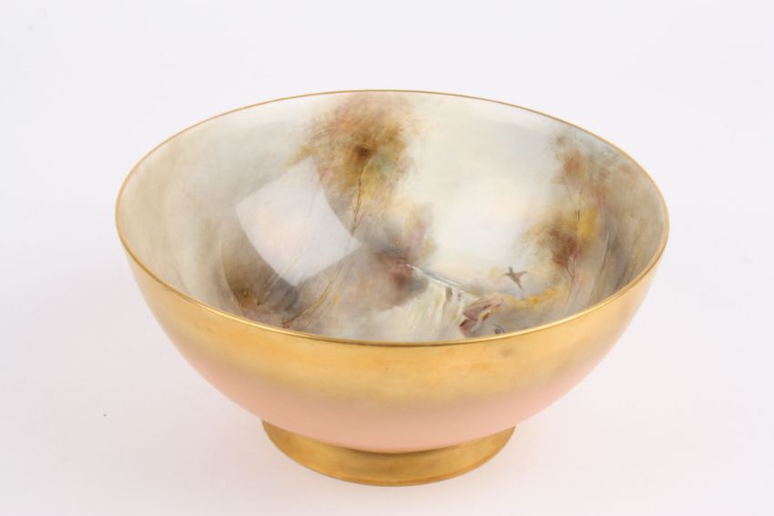 A large Royal Worcester bowl by James Stinton painted with a scene of pheasants flying beside a waterfall, the bowl of deep dished form with gilt exterior, marked to base c. 1901. 21.5 cm diameter, 10 cm high.Condition: Large repaired crack to foot. Otherwise in good condition.