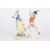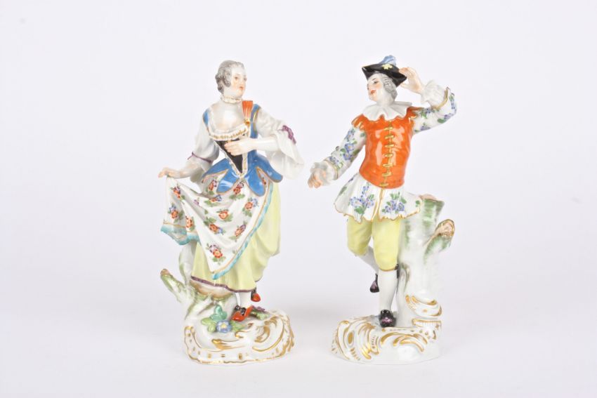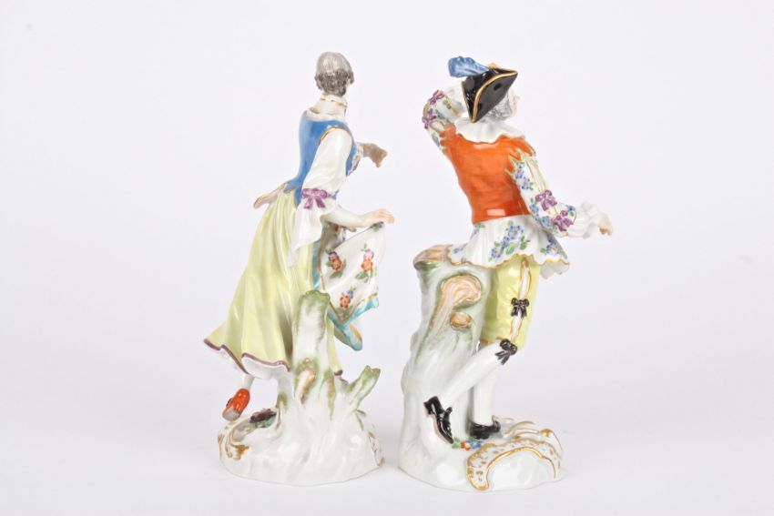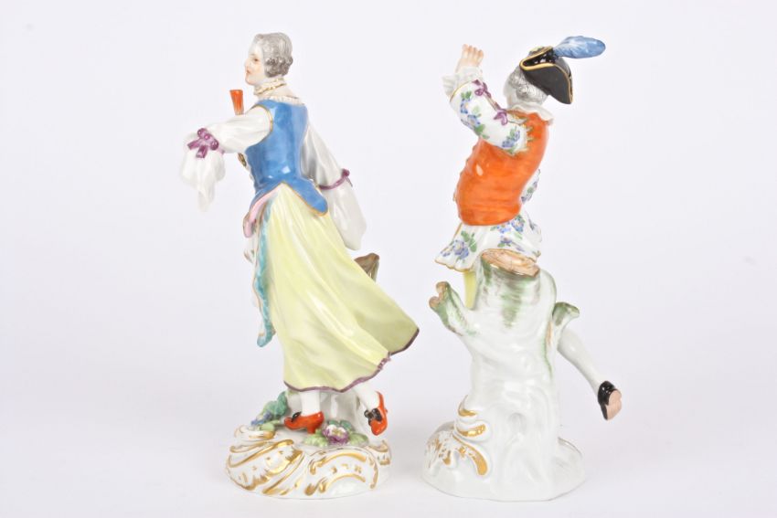 A pair of 20th century Meissen porcelain figures of a dancing man and woman both wearing colourful floral clothes and stood beside tree trunks on scrolled Rococo bases. Crossed swords mark to base and numbered 61118 and 61120. 17.5 cm high.Condition: Good condition with no damage.