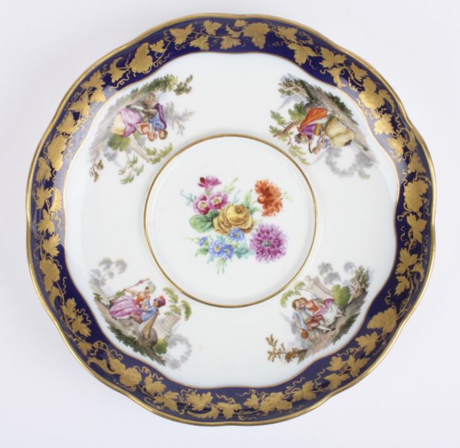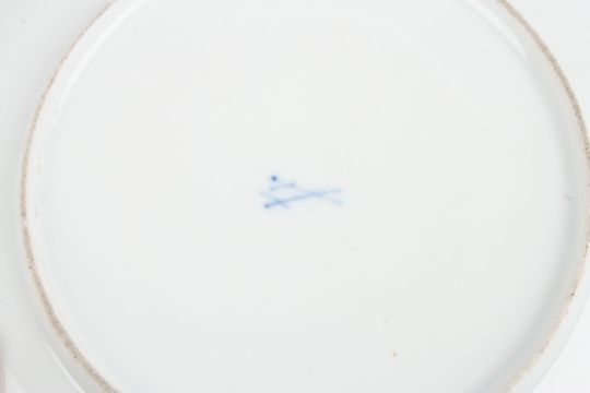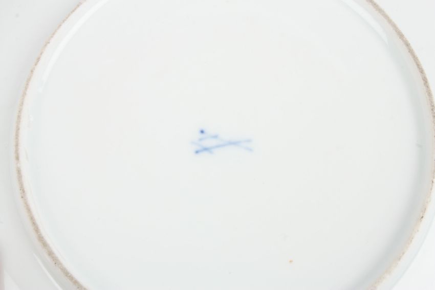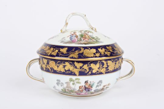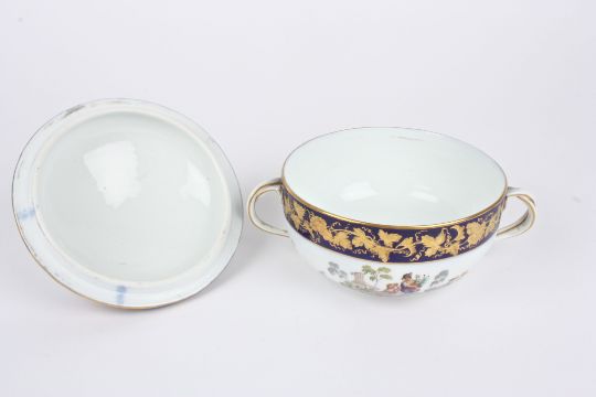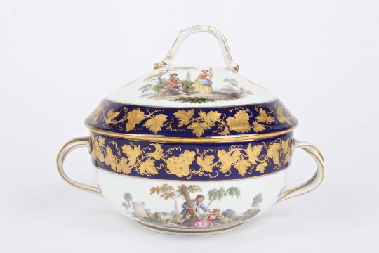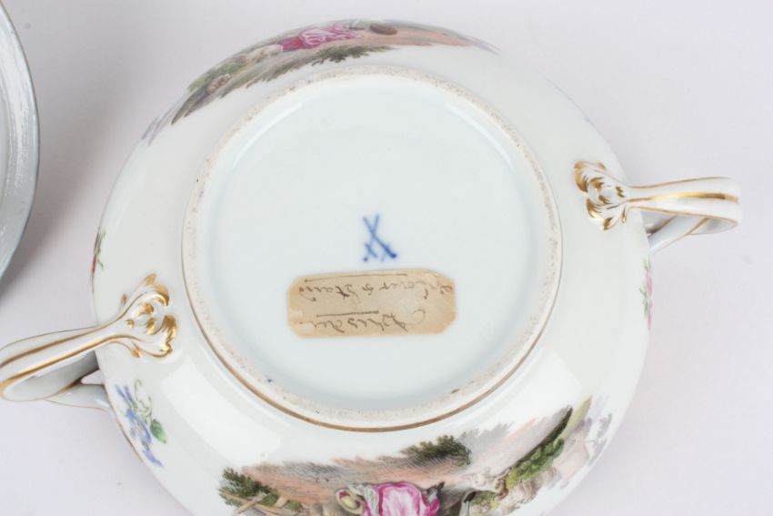 A large early 20th century Meissen chocolate cup, cover and saucer painted all over with scenes of courting couples in landscapes, and painted with sprays of flowers, with entwined handles and blue and gilt border. Crossed swords mark to base in blue. 23.5 cm wide.Condition: Handle broken off and repaired.