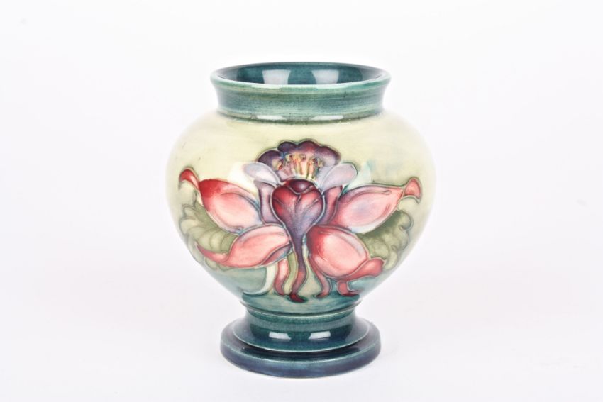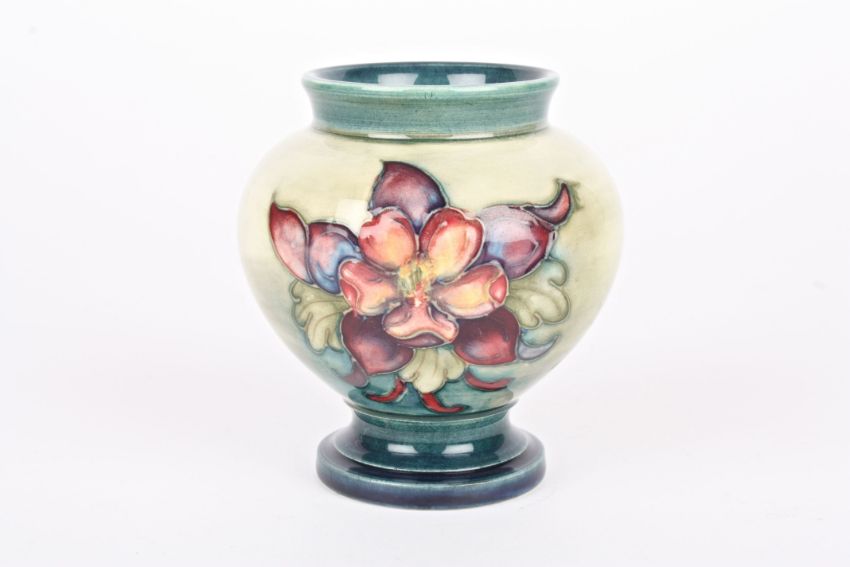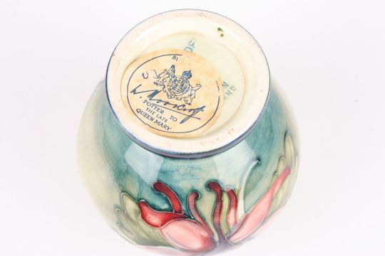 A small Moorcroft flower vase with tubelined decoration on a green ground. With Moorcroft label to base and impressed mark. 8.5 cm high.Condition: Good condition with light crazing.
