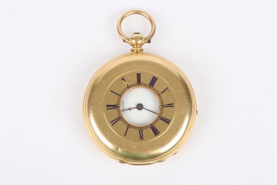 An 18ct gold half hunter pocket watch by S. Rubenstein of London the white enamel dial with black Roman numerals, the three quarter plate movement signed, case number 22563 and marked 18K. 40mm case.Condition: A little tired and some case wear, hairline crack to dial.