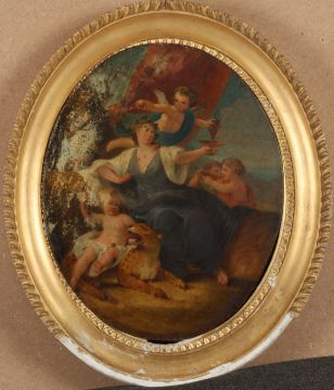 Attributed to Angelica Kauffman (1741-1807) A classical scene with a woman surrounded by cherubs with grapes, and a leopard at her feet. Oil on copper panel. Note: Christie's stencil verso, the painting was sold through them in 1904. In a gilt gesso frame. 27 x 21 cm.Condition: Some damage / wear to the left side of the image, some light chipping, no other damage.