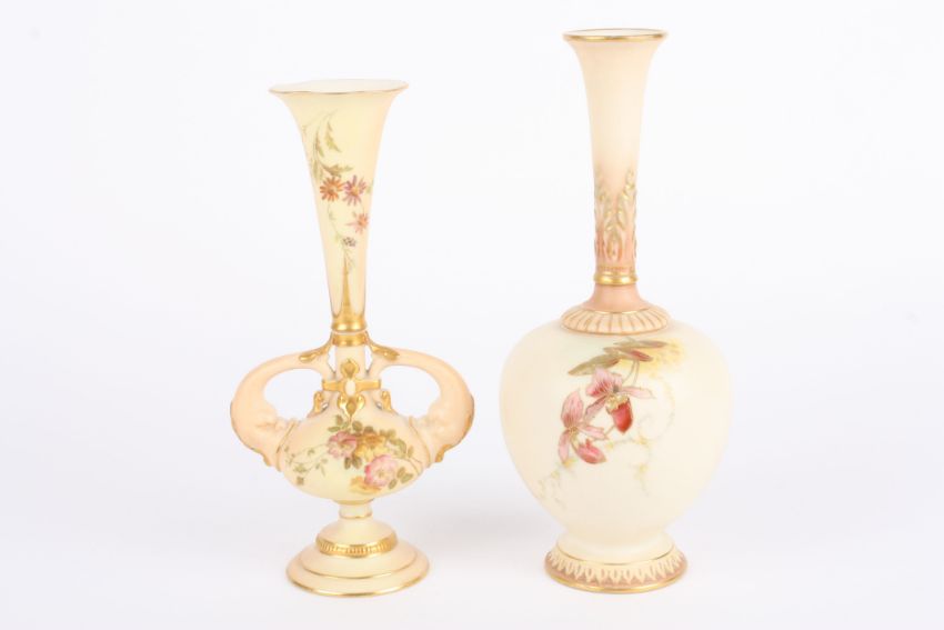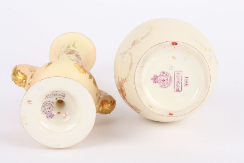 Two Royal Worcester blush ivory vases, both decorated with flowers, one with scrolled handles and flared neck, the other with bulbous body and a slender neck, puce mark and numbered 1749 and 1661 to the base (2) 21 and 23.5 cm high Condition: Both in good condition.