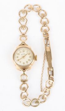A 9ct gold Record ladies wrist watch with mechanical movement, with ring mounted strap. 8.2 grams without movement.Condition: Generally good condition.