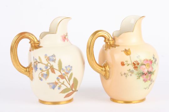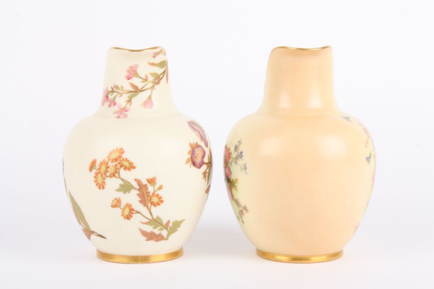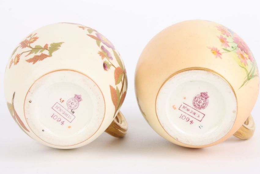 Two Royal Worcester flat back jugs, both decorated with flowers and numbered 1094 in puce to base (2) 16 cm high Condition: Both in good condition.