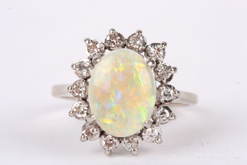 An oval opal and diamond cluster ring the central opal with good colour mounted within a single row of brilliant cut diamonds, 18 ct. white gold mount. Ring size O/P. Opal measures approx. 8 mm. top to bottomCondition: Overall good