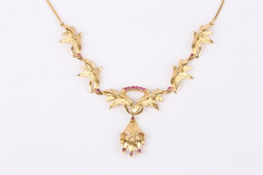 A mid 20th Century gold and ruby floral cocktail necklace the central floral drop set with three small rubies suspended from ruby set leaves between two articulated foliate sections to either side, each section spaced with a single ruby and with chain to either side, each piece marked .750 and 18ct, the leaves with textured detail. Weight approx. 17.4 gm Articulated section 14 cm. Length with chain 49.5 cmCondition: Overall condition is good