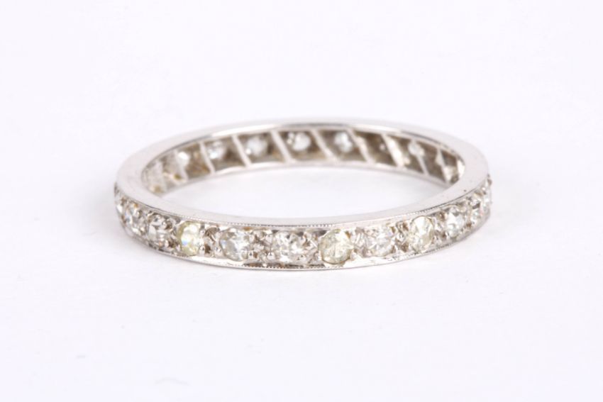 A ladies diamond set full eternity ring in white metal mount. Size Q/RCondition: Some damage to two stones, one rose diamond (replacement?), varied stone quality and some colour variation. (Acid test positive)