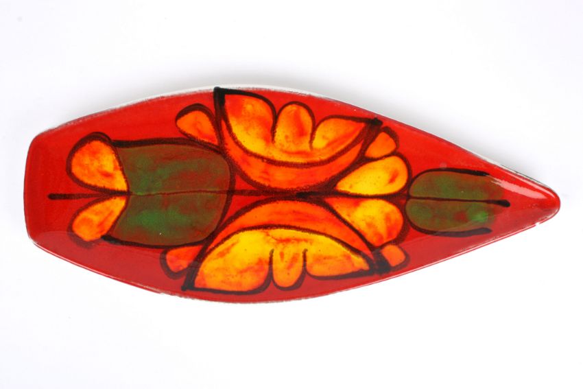 A large Poole pottery leaf shaped dish decorated with flowers on a red ground. Artists monogram to base 43.5 cm long.Condition: Good condition with no damage.