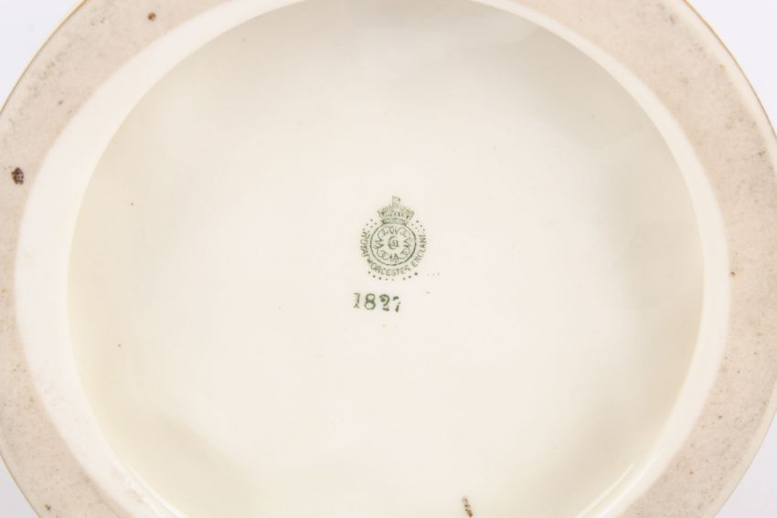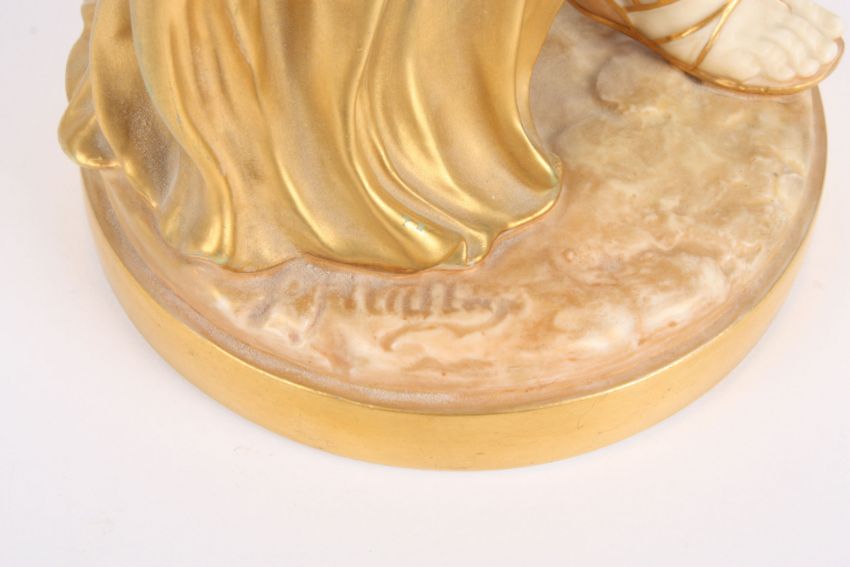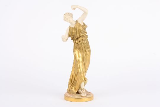 A large Royal Worcester gilt decorated figure of a classical woman in a long flowing robe holding castanets and supported on a naturalistic base, signed. Mark in green and numbered 1827 to the base, date mark for 1911. 33cm highCondition: Overall good condition although wear to certain folds of the robe.