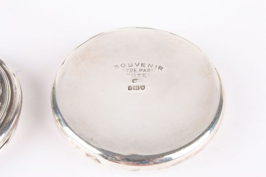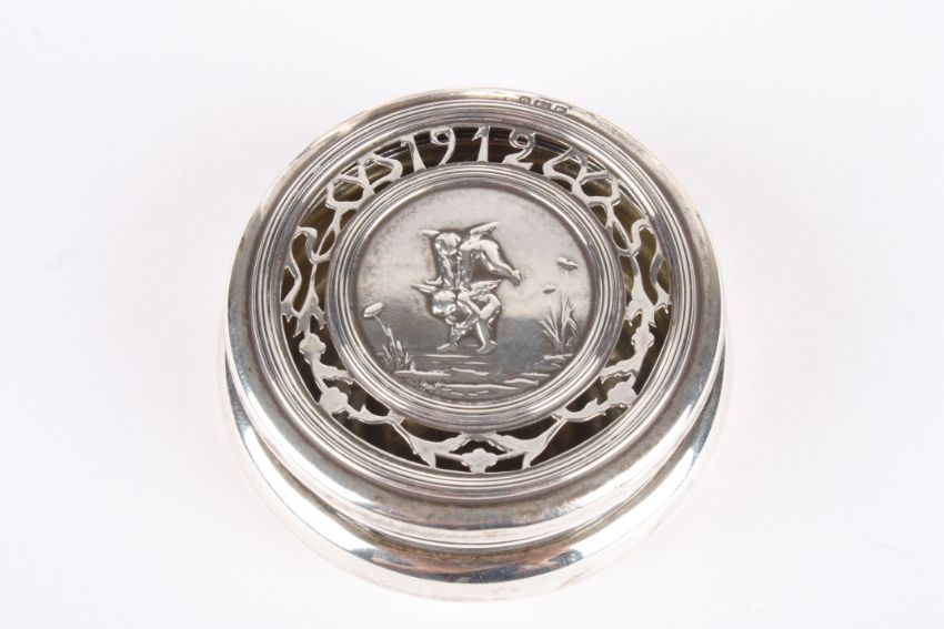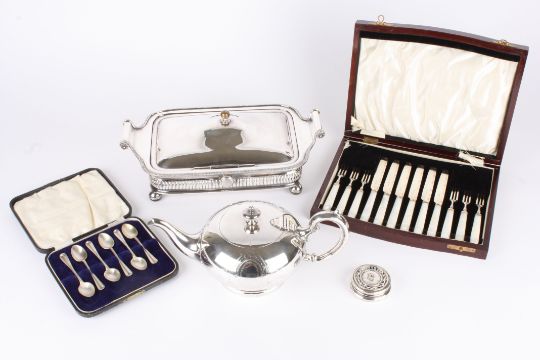 A small collection of silver and silver plate comprising a set of six silver cased spoons; a 1912 circular silver pin box with pierced lid and inset decoration of two winged cherubs leapfrogging, the reverse impressed 'Souvenir Hyde Park Hotel'; a Mappin and Webb silver plated service dish with scroll handles, a set of mother of pearl and silver plated fruit knives and forks and a silver plated Continental teapot (5) diameter of pin box 6cmCondition: Condition of all - good. Small pin tray with a few small dents to base lid.