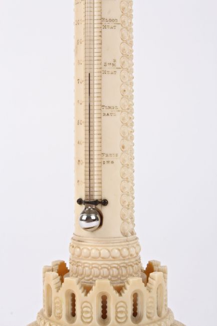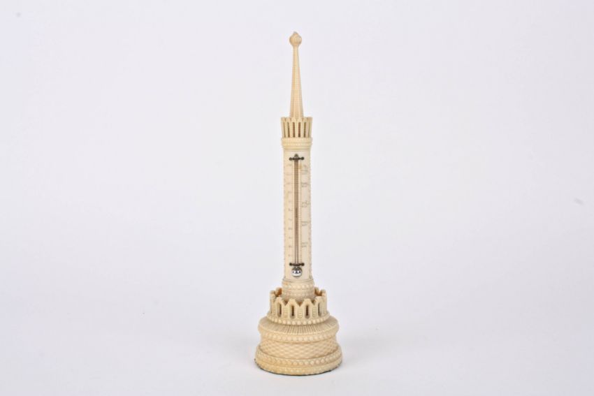 A late 19th century Continental carved ivory desk thermometer in the form of a minaret, with engraved scale from Freezing to Fever Heat, with carved and turned decoration. 25.5 cm high.Condition: Very tip of finial missing, otherwise in good condition.