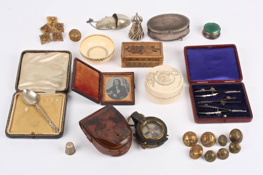 A turned antique small ivory bowl with pen work decoration and an ivory box and cover, an 18th century small straw work box, various Victorian military buttons , military compass in leather case, small set of drawing instruments, cased photograph and a small collection of silver including a silver thimble. (Q) Ivory bowl 7 cm diameterCondition: Suggest view in person. Some items damaged, silver a.f. straw work a.f. ivory box a.f.
