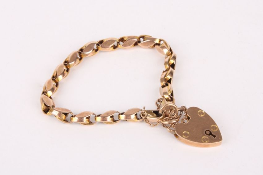 A Victorian fancy link yellow metal bracelet with 9ct gold heart padlock fastening. weight approx. 14.6 gm.Condition: Overall good, slight reasonable overall even wear. Bracelet acid test positive