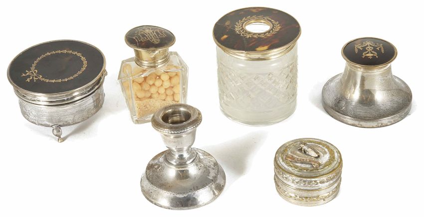 A small collection of tortoiseshell and silverwarecomprising a silver trinket box with tortoiseshell lid, silver inkwell with tortoiseshell lid, glass jar and bottle both with tortoiseshell lids a/f, silver weighted candle stick holder and French small silvered pill box with mounted bug and stamped Arles diameter of former 7.2cmCondition: The trinket box in good condition just rubbing to marks. Bottle with chewed and split lid. Jar with cracked lid. Pill box rubbed and worn. Candlestick lots of small dents.