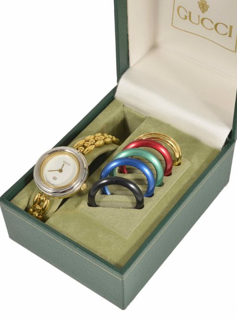A vintage Gucci dress watch with interchangeable coloured dial trims, original fitted Gucci box Condition: Overall good, movement not checked