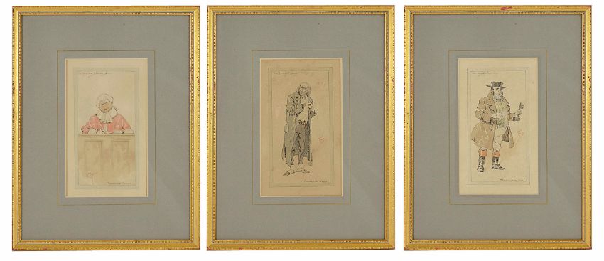 Joseph Clayton Clarke 'Kyd' (1857 - 1937) Britishthree framed illustrations of characters from Dickens novels 'Pickwick Papers' and 'Sketches by Boz', each on paper with black ink and watercolour, all signed Kyd, 34.4 x 26 cm framedCondition: