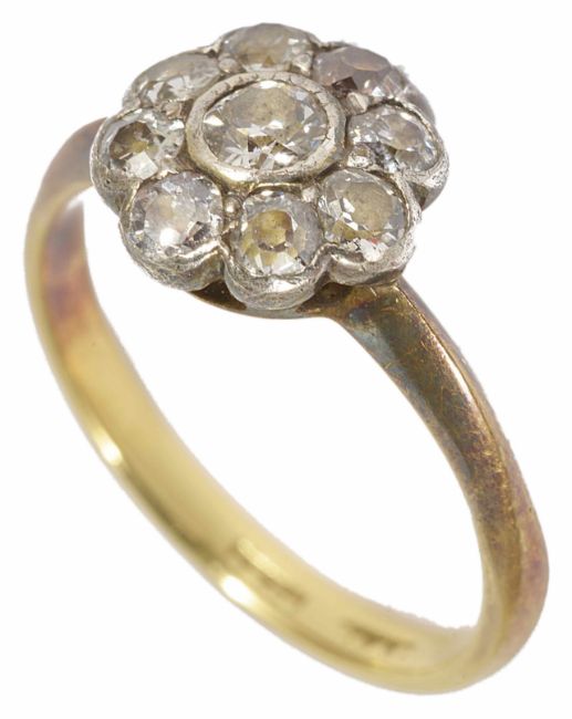 A late Edwardian circular diamond set cluster ring, 18ct gold and platinum mount size LCondition: Overall wear to mount, heavy rubbing to top and some slight edge chipping to one outer stone
