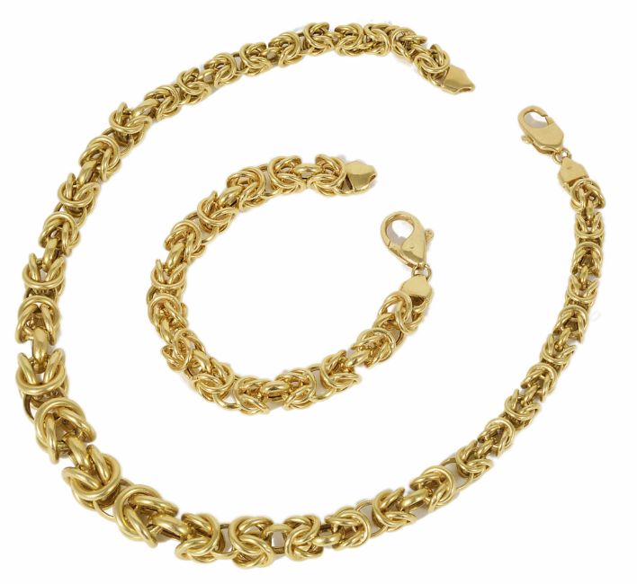 A striking Continental 18ct gold necklace and matching bracelet the necklace of graduated 'chunky' interlocking cable design and with lobster clasp fastening sold together with the matching gold bracelet, weight 81g approxCondition: Overall good