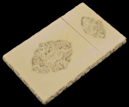 A late 19th/early 20th century Chinese Canton carved ivory calling card casethe front and reverse carved with two vignettes featuring figures surrounded by plants and temples, the sides carved with leaves length 11.5cmCondition: Opens and closed with a little stiffness, but closes flush. With no damage to ivory. In good overall condition.