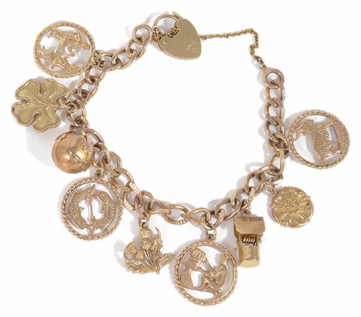 A 9ct gold curb link charm bracelet with heart padlock fastening, hung with a variety of charms including opening Masonic ball pendant, a Tudor rose, wishing well etc. Weight approx. 31gm.Condition: Overall good