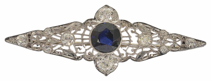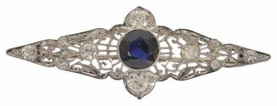 An Art Deco filigree gem and diamond brooch with central blue sapphire (untested) within a pierced white metal, diamond set mount. weight 4.6g central stone approx. 2.00 ct, total diamond weight approx. 0.75 ct.Condition: Diamond to right replacement stone shows a slight yellow, Blue stone damaged (Long chip) to edge