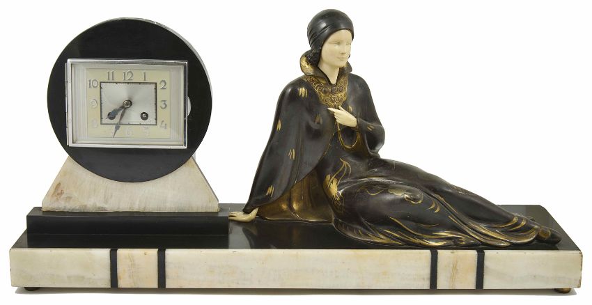 A 1930s Art Deco mantel clockdecorated with a reclining lady with ivorine face and hands, the clock with rectangular dial and supported on a marble base. H30 x L63 cm. Condition: Some tarnish in places, but generally in good condition.