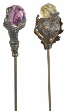 Two Edwardian hat pins the first with silvered metal thistle supporting faceted citrine and another in the form of a claw length 20cmCondition: The former in good condition, the second with section missing and in poor condition.