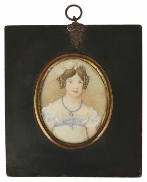 An early 19th century miniature on ivoryof a young girl wearing a blue and white dress with ringlets and flowers in her hair length 7.5cmCondition: Requires some light cleaning, otherwise in good condition.