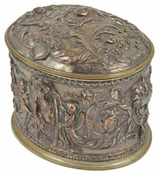 A gilt metal silver plated Continental tea caddyof oval form decorated with a band of figural maidens and cherubs amongst foliage and mask heads, the hinged lid with embossed central mask flanked by foliage, containing two demi-lune tea caddies with foliate engraved lids, 12.5 cm high, 14.5 cm width, 11.5 cm depthCondition: Nice condition with apparent wear to external silver plated surfaces