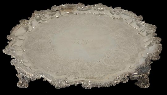 A large George IV silver trayhallmarked London 1828, with shaped scrolled border, raised upon four gadrooned scrolled pierced supports, the central floral decorated cartouche, engraved with monogram MCC. Makers mark: Joseph Craddock 182 ozt total weight, 64 cm diameter, 6 cm highCondition: Condition excellent, with obvious wear throughout, scratches to surface.