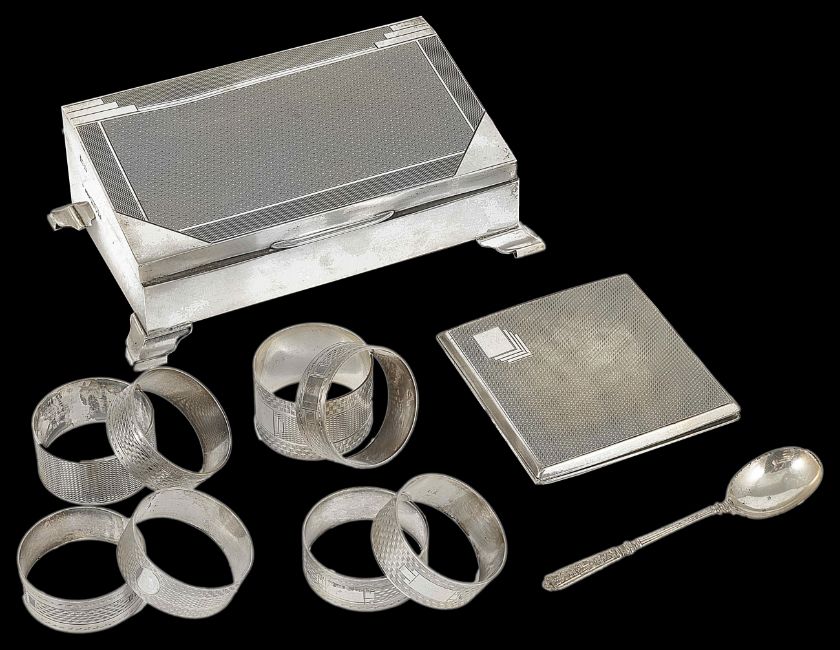 An Art Deco cigarette casehallmarked Chester, of slanting rectangular form, with engine turned decoration and stepped feet, together with a square silver Deco silver cigarette case, eight assorted silver serviette rings, and a plated teaspoon width of case 15.5cm, overall 20 oztCondition: Cigarette case with slight dent but generally in good condition.