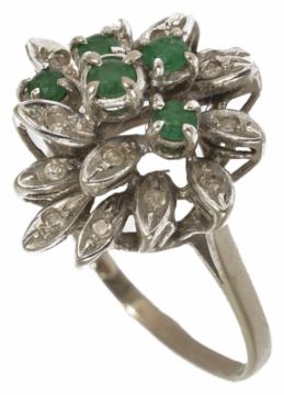 An emerald and diamond set floral cluster cocktail ring, circa 1970 with 5 central emeralds within a diamond set free form foliate design cluster, white gold mount Size R/S. Shank worn and with break line beginingCondition:
