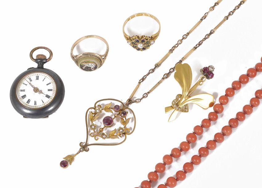 A Victorian single row red coral necklace of even size beadstogether with a ruby and diamond trefoil set brooch, a ladies gun metal and gold fob watch 'Ella", a 9ct gold Art Nouveau scroll pendant on gilt chain, a Victorian micro mosaic ring, tests for gold and a 15ct gold Victorian pearl and gem set ring Condition: Coral in good order, trefoil brooch slight repair to reverse, watch overall good, pendant overall good, mosaic ring has been glued to mount.