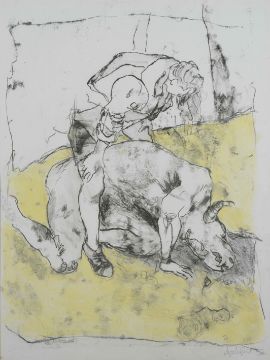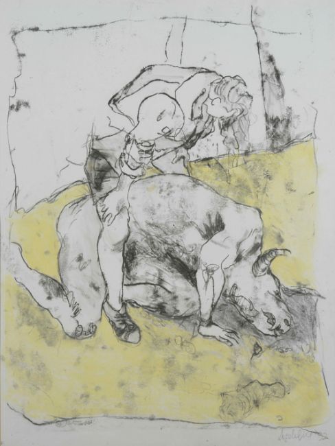 Angela Gill (fl. 1991-1993) British, Untitled, a sketch of a woman standing over a dead centaur, ink, charcoal and pastel on paper. Signed and dated '92. Framed. 70 x 53 cm.Condition: In good condition with no damage.Artist’s Resale Right (ARR) royalties of 4% apply to this item if the sale price reaches or exceeds the sterling equivalent of €1,000