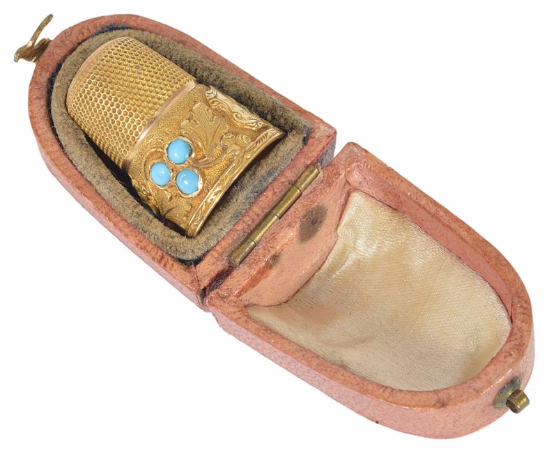 An antique 15ct gold thimble decorated with raised and engraved foliate scrolls and set with turquoise. Maker C.M. Fitted hinged case weight 6.1gCondition: Overall good, some fading to leather case
