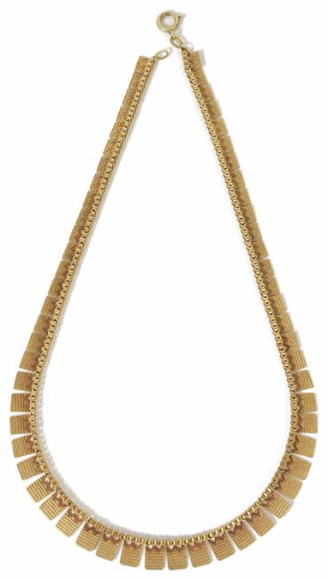 A contemporary Etruscan style 9ct. gold panel necklace, fully articulated and graduated to either end weighs approx. 20.4 gm.Condition: Overall good