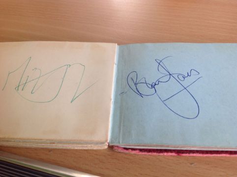 Rolling Stones autographsSigned in an autograph book including Brian Jones, Charlie Watts, Bill Wyman, Mick Jagger and Keith Richards, together with a letter to a young girl signed Bill Wyman (the letter probably in another hand) Condition: Brian Jones good clear signature signed in blue, Mick signed in green pen. Charlie Watts faint green pen. Bill Wyman signed twice once with lock of hair taped in book. Keith Richards in green pen quite clearly.