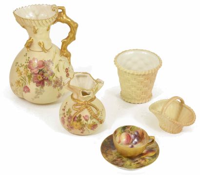 A small collection of Worcester including a miniature cup and saucer together with four pieces of blush ivory, jug numbered 1507, small vase numbered 511, basket weave pot numbered 857 height of jug 16.5cmCondition: All in good condition although chip to inside rim of miniature cup.