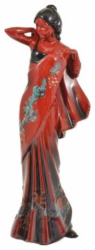 A Royal Doulton flambé figure of a lady, Eastern Grace dated 1996, decorated with mottled effect. Royal Doulton mark to the base, numbered 1034. height 31.5 cm Condition: Appears to be in good overall condition with no apparent damage.