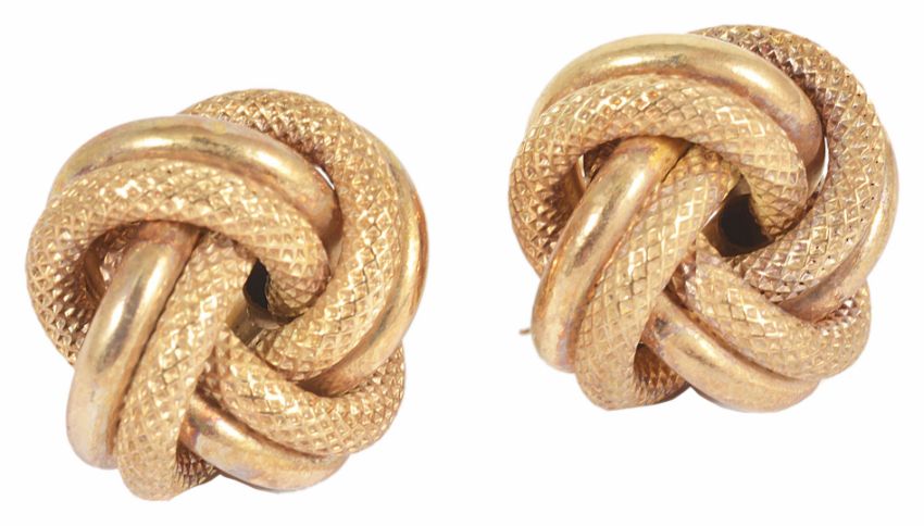 A 9ct gold ring of modernist bombe design with textured finish and double shank, together with a pair of 9ct gold Turkish knot design earrings (2) Total weight approx. 13.5 gm. Size Condition: Ring engraved to inside, some marks and scratches to shank only. Earrings overall good