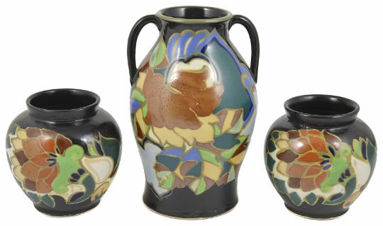 A large Gouda style twin handled vase decorated with stylised flowers and leaves against a black ground together with a pair of similarly decorated vases, no marks (3) tallest vase height 23.5cmCondition: One of the pair of vases cracked